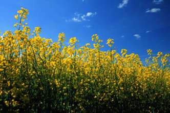 Canola flowers in Canadian field. Canola is a part of the Brassica family related to broccoli and kale.